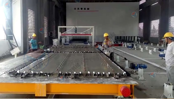 PC環(huán)形疊合板/內(nèi)墻板生產(chǎn)線的主要設備包括雙梁橋式起重機、清理機、脫模劑噴涂機、布料機、振動臺、趕平機、拉毛裝置、預養(yǎng)窯、抹光機、碼垛車、養(yǎng)護窯、翻轉機、擺渡車、支撐滾輪、驅動輪、模臺和成品運輸車等。