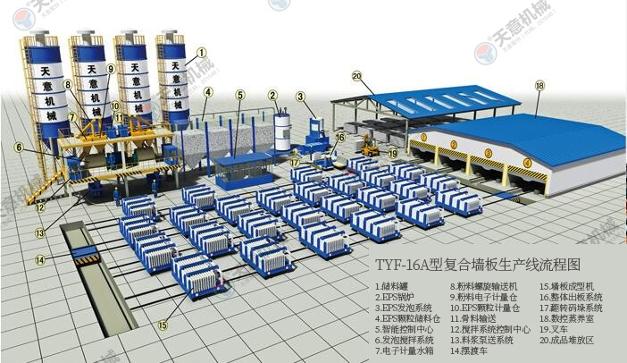 TYF-16A型復(fù)合墻板生產(chǎn)線是公司綜合國內(nèi)外技術(shù)經(jīng)驗(yàn),開發(fā)研制的新型墻體板材生產(chǎn)線。復(fù)合墻板生產(chǎn)線主要分為配料系統(tǒng)、攪拌系統(tǒng)、發(fā)泡系統(tǒng)、數(shù)控配電系統(tǒng)、墻板成型系統(tǒng)、料漿泵送系統(tǒng)、EPS預(yù)發(fā)系統(tǒng)、液壓循環(huán)系統(tǒng)、整體出板系統(tǒng)。